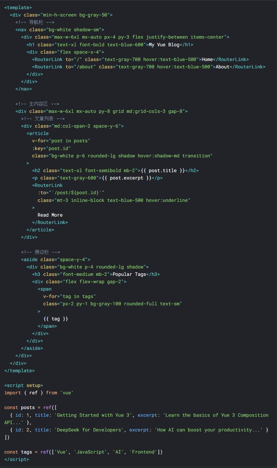 >“帮我设计一个博客网站首页,包含导航栏、文章列表、侧边栏推荐和页脚,使用Vue和Tailwind CSS实现。”