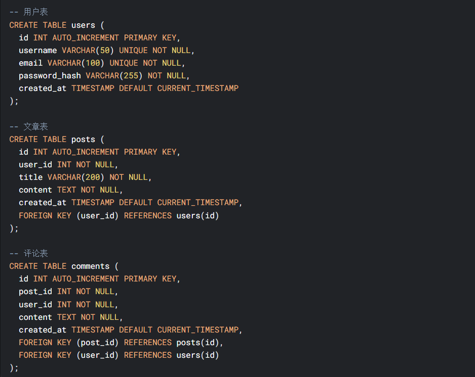 >“设计一个博客系统的数据库,包含用户、文章、评论表,用SQL语句。”