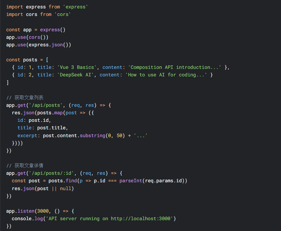 >“用Node.js + Express写一个博客API,包含文章列表和详情接口。”